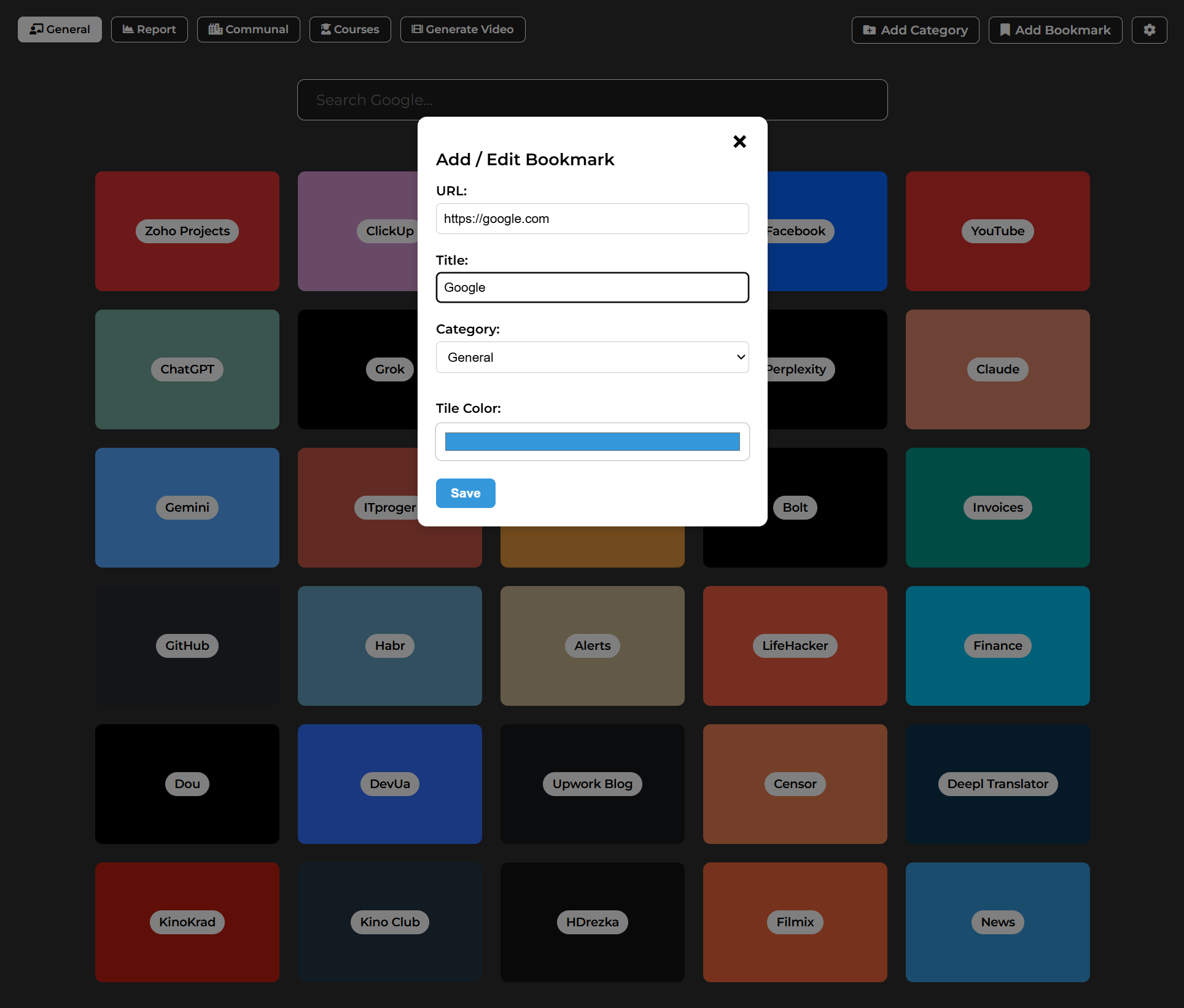 Quickly create or modify tiles with colors, titles, and categories.