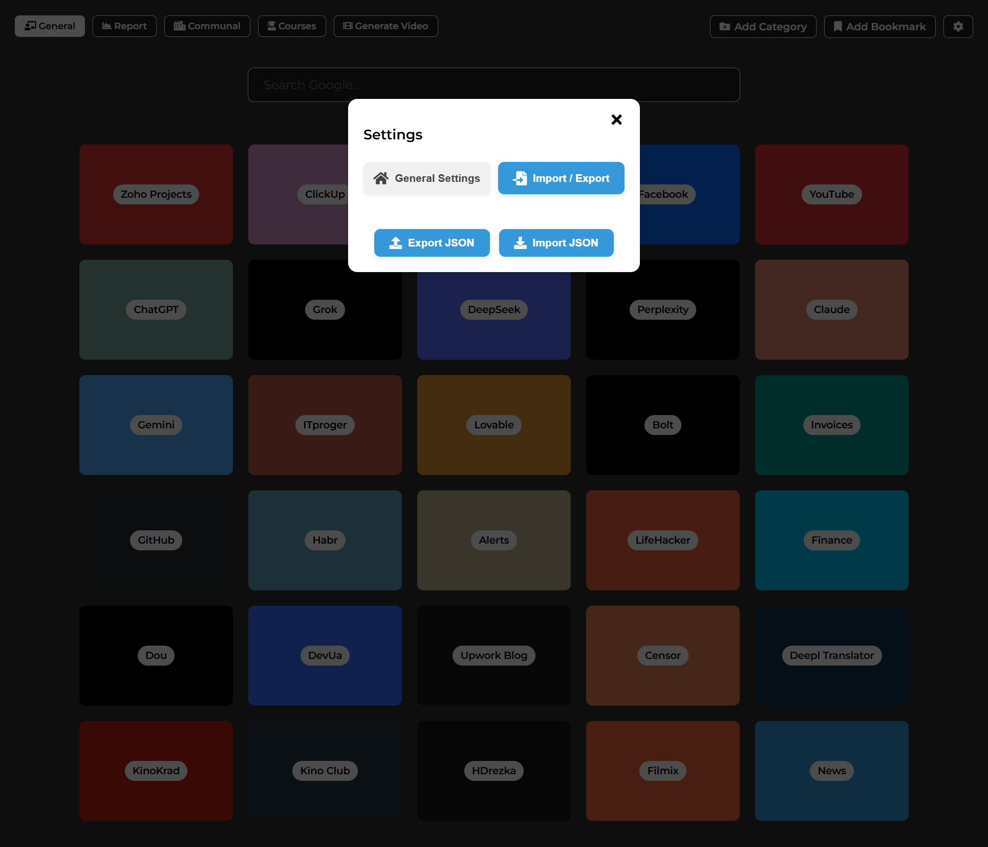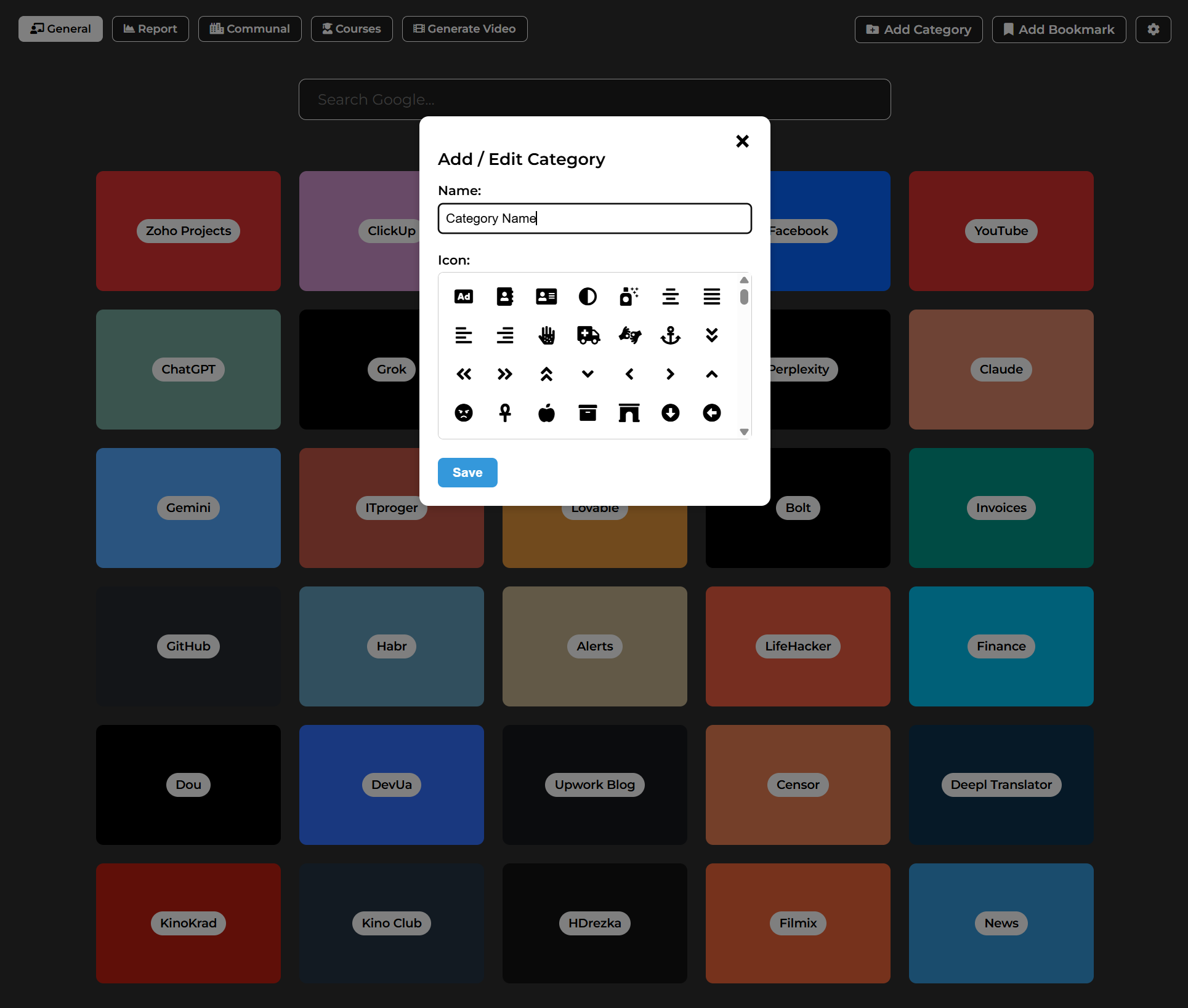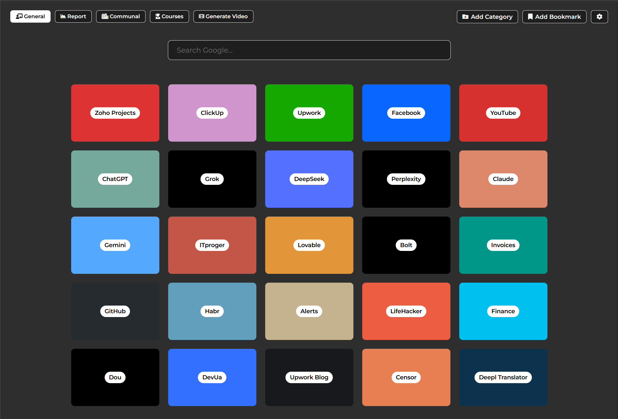 Visual tiles grouped by category for instant access to your favorite websites.